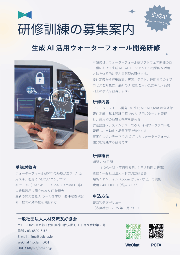 本研修は、ウォーターフォール型ソフトウェア開発の各工程における生成AI・AIエージェントの効果的な活用方法を体系的に学ぶ実践型の研修です。